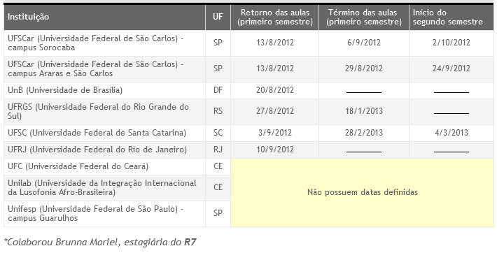 Já a UFSC (Universidade Federal de Santa Catarina) recomeça o período letivo na próxima segunda-feira (3). O calendário acadêmico prevê que as aulas terminem no dia 28 de fevereiro de 2013.